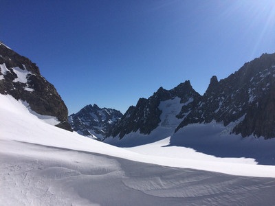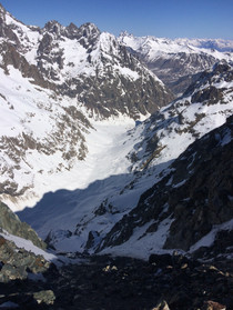 Après ces 2 premières semaines au refuge consacrées à l'installation et à la prise en main de la cabane, ce matin été consacré à une petite virée à ski, histoire de se faire un avis perso sur les conditions du moment, de ramener quelques photos et de repérer le captage d'eau. Un petit enchainement au col des Écrins, au col de Roche Faurio et à l'épaule de Roche Paillon a rempli mes attentes. J'y ai même trouvé de quoi faire 5 virages dans de la poudreuse (je vous jure!). Pour faire bref, le Dôme attendra la prochaine chute de neige pour être skier sereinement, les faces Sud (en prenant son temps) sont en bonne neige printanière, les câbles pour passer le col des Écrins sont accessibles et le rocher bien sec, le couloir Nord du col de Roche Faurio est sec, les perturbations printanières seront les bienvenues.